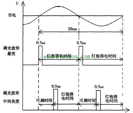如图2所示,控制器中的MCU通过调节图中的“可调时间t”,来控制一个周期内灯的得电时间,从而调节灯的亮度。单元调光控制器可以通过无线接收模块接受主控制器的控制,通过对遥控器的学习后,也可以直接接受手持遥控器的控制。