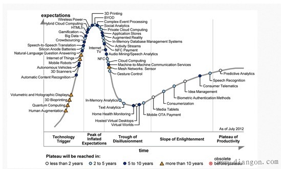 下图是2012年国际新技术发展图,目前最具期待的技术3D打印居首,但技术达到平稳、成熟期需要十年左右。
