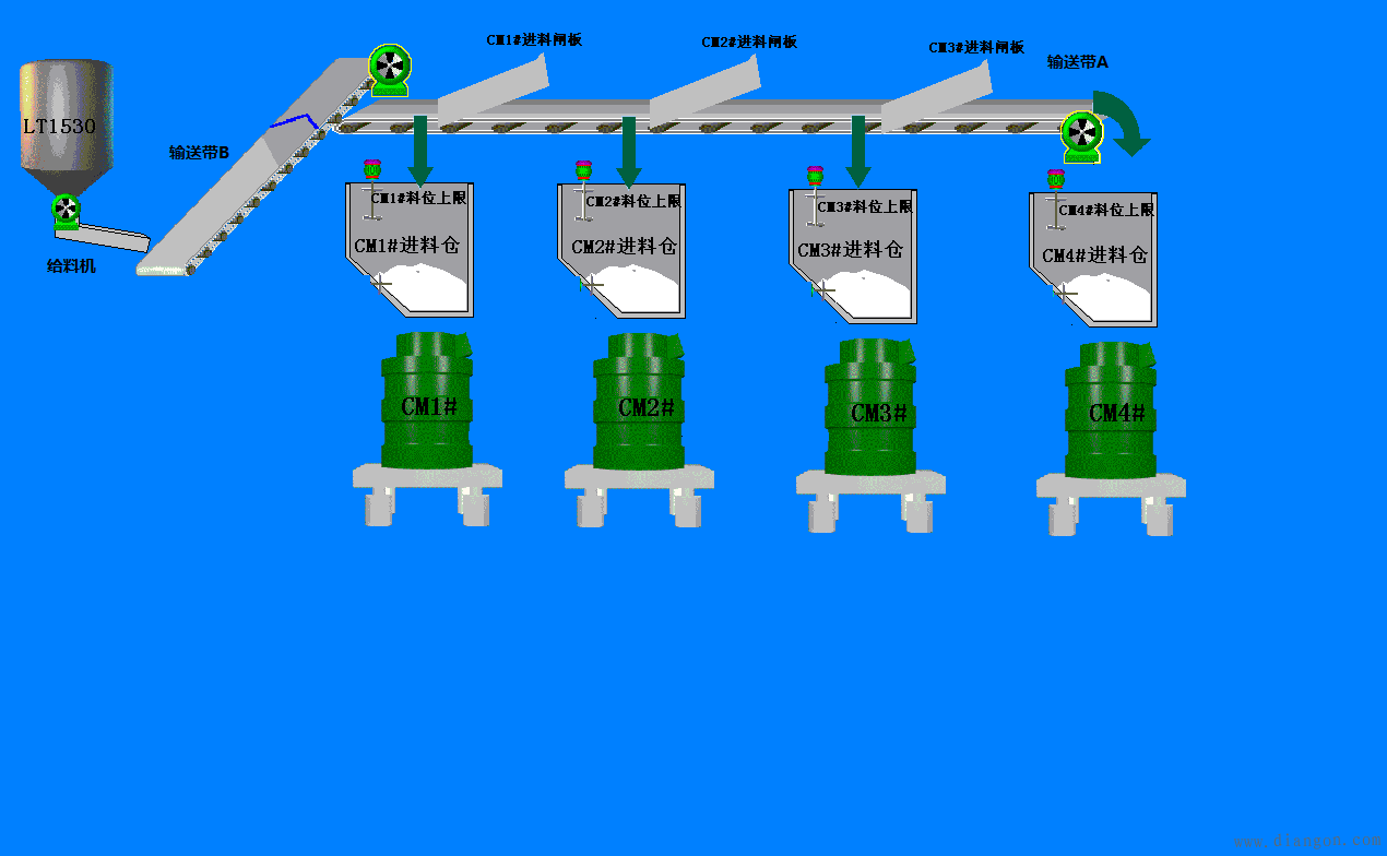 当处于手模式时,按一下相对应的进料仓进料按纽,如1#进料按纽,输送带A开启,2秒钟后,输送带B开启;再过2秒钟后,且1#进料闸板落下,输送带B的进料给料机开启。当中途要进另一条料仓时,本料仓进料闸板落下,非本料仓进料闸板抬起。当料仓满后,进料系统会接到上料位信号自动停止进料。