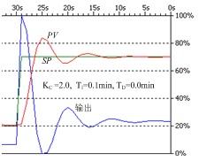 将图5中的微分时间改为0.0min,其他参数不变。微分时间由0.01min减为0后,图6中响应曲线的超调量和震荡次数增大。可见适当的微分时间对减小超调量有明显的作用。