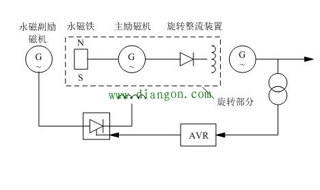 整个励磁系统主要由副励磁机、主励磁机、旋转整流装置和AVR-PU励磁调节器组成。副励磁机产生的三相电流(400Hz)经功率单元整流后供给主励磁机励磁绕组(定子),主励磁机电枢(转子)输出的三相电流(150Hz)直接进入旋转整流装置,旋转整流装置的直流输出即进入发电机转子励磁绕组,从而构成了发电机的励磁电源。