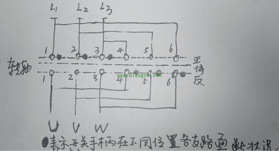组合开关内部结构基本都大同小异,搞懂控制组合开关内部结构,也就基本上明白所有组合开关的工作原理,控制组合开关内部是动静两组触点的组合:其开关右侧三个静触点,分别标有L1L2和L3,左侧对应也有三个静触点,分别标有UVW,主转轴上固定两组六个动触点,主轴旋转手柄有“正”,“停”,“反”三个位置,当转到“停”位置时,两组静触头与动触头均无接触,相当于电路断开,电路处于断路状态;当手柄旋转到“正”位置时,一组动触头与一组静触头相接触,电路接通;当手柄旋转到“反”位置时,另外一组动触头分别与另一组静触头相接触,改变相序达到控制电动机正反转的目的。