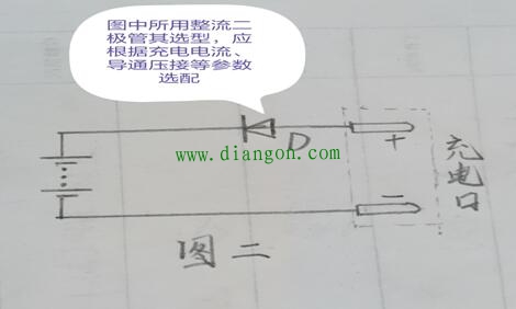 那么有没有一种简单易行且行之有效的方法,避免事故发生哪?对此,小编利用我们电工技术中最为基础的半导体元件——二极管的单向导电特性加以解决,其方法如图二示。在充电过程中,由于充电器输出端电压要高于电瓶电压,故串入的二极管(整流型)正向导通,保障了充电过程正常进行;而在非充电阶段,因电瓶+极所接为二极管的阴极,故二极管反向截止——此时充电口内+、-两受电片间是测量不出电压的,所以即使将两受电片短接,电瓶也不会发生短路故障,从而避免了事故发生!