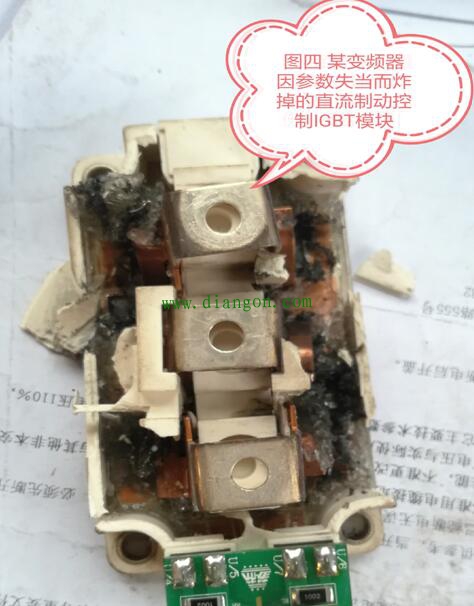 三、有关参数设置错误或失当,同样会导致电子设备出现炸机故障。图四是一台55KW变频器制动部分炸裂的IGBT功率模块,至于造成这一现象的原因则是制动时间参数设置过短,迫使IGBT模块瞬时流过几倍额定值的电流冲击所致!