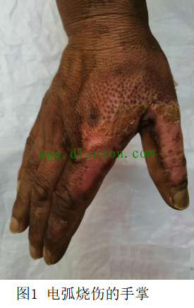 这不,就在前几天,在一个酒楼装修工程项目中,电工张师傅正忙着安装一个户内配电箱,干了一个上午才接近尾声,很想在上午下班前检查一下配电箱的控制效果,就指派小王去接电。按说这个活技术含量并不算高,小王应该可以驾轻就熟地完成,接受师傅的安排后,立即放下手头的其它活,穿上绝缘鞋,整理好长袖衣裤,按照没电当作有电来防范的要求,去给已知无电的空气开关接线送电。三根导线已经接好两根,在接最后一根导线时,用衣袖擦拭额头上的汗液时,另一只手握着已经剥去绝缘皮的导线不经意的触碰到相邻相线的接线柱,顿时电弧猛然燃起,将小王的手掌严重烧伤,令人惨不忍睹,图1是烧伤几天后伤势已经略有恢复时的样子。