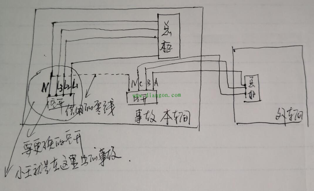 到此为止,事故原因已经找到,这个带电空开的三相电取自另外一个车间,只拉了三根火线,零线借用事故车间的零线。