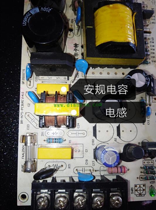 开关电源的这个由电感和电容组成的抗干扰电路特征非常明显,它一般由一个外观小变压器一样的电感和两个方方的安规电容组成,这里基本上不会坏,特别是电感极少出现断路的故障,因为是串联在电路中,所以电感不存在短路,除非市电特别稳定,否则安规电容也很少有烧毁短路的情况。