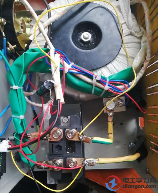 一次绕制完成后,绕制二次,设计12V电压,绕制15匝。绕制完成后,在某网上购买整流桥、档位开关、电压电流表、电瓶夹出线接头。将绕制好的环牛变压器装入原来箱子内。