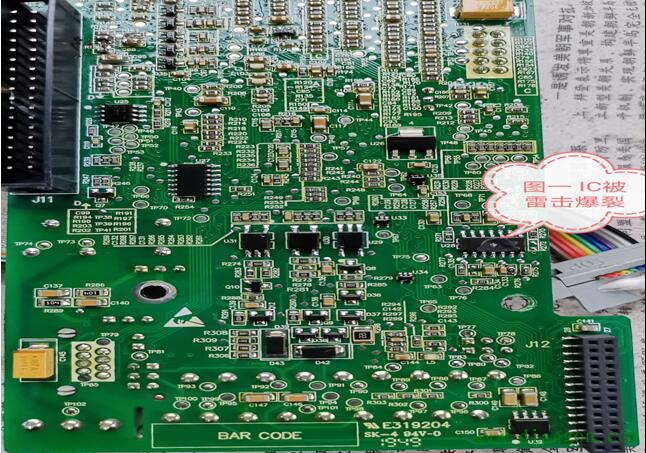 10月3日傍晚,距离公司约30KM的下辖建材厂,正在运行使用中的一台驱动水泵之55KW某品牌变频器,突然自动停止运行,并显示出故障代码“F4”,且无法通过复位操作消除。次日笔者奉命赶到现场后,通过网络查询出变频器故障代码含义为:主板故障。断电、放电后,对变频器做拆机处理,笔者在对主控板的观察过程中,赫然发现线路板“+10V”端子同变频器金属壳体间(即接地端)的一粒贴片涤纶电容已烧毁!而主控板背面两个贴片集成块,也存在明显烧毁现象——其中一颗更是直接炸毁(图一示)!