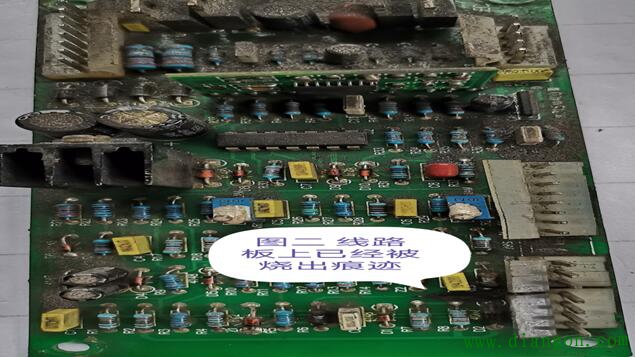 10月6日,单位机械维修车间使用的一台ZX7系列逆变式焊机,在焊接过程中突然发出“啪”的一声,便出现无输出现象(显示正常)。笔者接手做拆机后,发现该焊机内部有厚厚的一层灰尘——尤其是水平放置的“PWM信号发生控制”线路板上,更是灰尘多到让人震惊的地步!对积尘略做清理后,笔者发现“PWM信号发生控制”线路板上有两支色环电阻已烧毁,并且最为严重的是线路板上有一道深深的烧痕(见图二)!