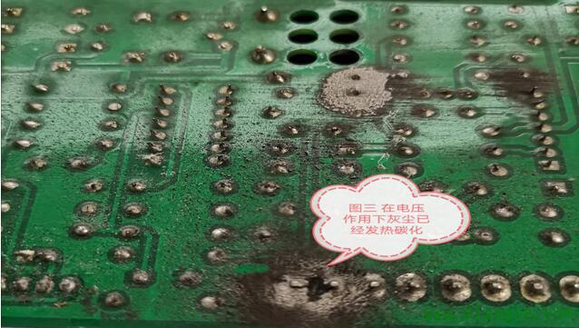 之所以出现此次故障的原因,毫无疑问同线路板上灰尘堆积过多有直接关系:在电压作用下,类似电阻的灰尘发热不断累加(图三示),继而导致线路板被烧毁,受此牵连电阻等电子元器件也发生损坏!