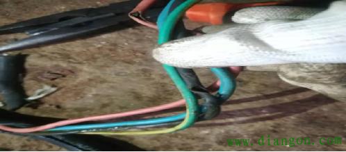 为了尽快找到故障点。我直接来到水泵与有机提升泵电机接线盒的接头处,直接将接头拆除,测电机阻值,阻值还是一样。难道泵真烧了?这可是新泵啊。为了进一步确定自己的判断,我让师傅们送电,量测接头处的电压,三相电压407-408伏的样子,电源端的电压及线路问题基本排除,看来问题还是在泵上。我又望了望这个大家伙,居然还是台316材质的防腐型水泵,用料这么讲究,不可能这么容易坏,而且一些优质水泵内部还有保护,但这种新泵才采购的也不能乱拆啊。为了确定到底是不是泵真的坏了,以便退货处理,我决定将泵另外接个三相电源再试一下。于是将泵拉到维修部接到专门试机的断路器上,通电还是没有任何反应。基本确定就是泵的问题了,但令我有点想不明白的是为什么三相阻值都如此不稳定呢?我一边拆线准备还给仓库按退货流程处理,一边有点百思不得其解,一边还有点忐忑不安,难道就这样下结论吗?可就在将线快盘好时却发现电缆有一处不仅破皮了,而且还有红线和蓝线几乎断完了,有三两根铜丝连着,可能是之前废药水渣渣呈黑色与电缆线外皮相同的缘故,将这个断点完美地隐藏了起来。而我们放在手推车上拉到维修部,可能是一路的震动将渣渣抖落了,才使它原形必露(剥开外皮后可以看到损坏的接头,见图二)。