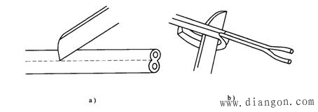 a)切人手法 b)电工刀以45。倾斜切入 c)电工刀以25。 倾推削 d)翻下塑料绝缘层