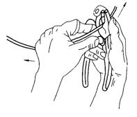 ② 距织物保护层10mm 处,用钢丝钳刀口切割橡皮绝缘层。注意不能损伤芯线,拉下橡皮绝缘层,方法与图3类同。