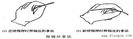 焊锡丝一般有两种拿法。如右下图所示。使用电烙铁要配置烙铁架,一般放置在工作台右前方,电烙铁用后一定要稳妥放与烙铁架上,并注意导线等物不要碰烙铁头。由于焊丝成分中,铅占一定比例,而铅是对人体有害的重金属,因此操作时应戴手套或操作后洗手,避免食入。