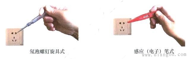 氖泡螺钉旋具式试电笔的使用方法:中指和食指夹住验电器、大拇指压住手触极,触电极接触被测点,氖泡发光说明有电,不发光说明没电,如下左图所示。