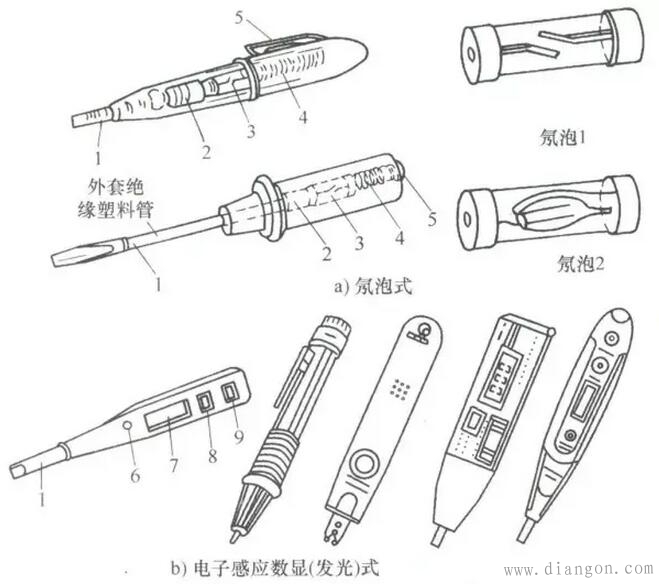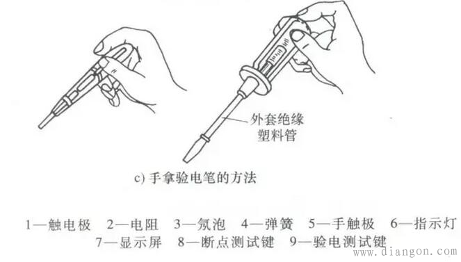 使用电笔来验电,防止触电保安全。 手触笔尾金属点,千万别挨接电端。 笔身破裂莫使用,电阻不可随意换。 保持干燥常清洁,不可接触高压电。 低压验电笔只适用于检验500V以下的低压电,所以绝对不可用它去接触高压,否则将很危险。在使用低压验电笔检验某部位是否有电时,手应接触笔尾的金属点,千万不要去接触前端与电路相接触的金属部分,如图1c所示。若笔身出现了裂纹,其绝缘性能将降低,不可再使用。若笔中的电阻丢失,不可随意用另一个其他的电阻更换,否则有可能因阻值小而加大通过使用者身体的电流(低压验电笔的电阻一般在1~2MΩ之间),造成伤害。要经常保持笔身的清洁和干燥,目的是防止其外皮污染后降低绝缘性能。 另外,为了确保安全,握笔的手应保持干燥。