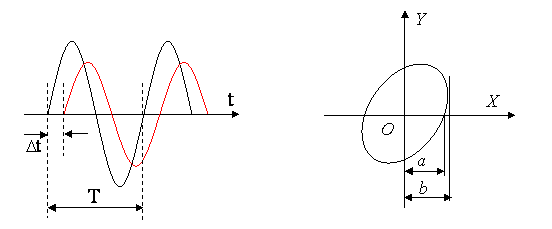 图1 YT工作方式下相位差测量 图2 XY工作方式下相位差测量