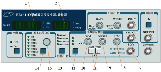 频率调节:信号的频率由频率粗调【14】选定频段,频率细调【15】进 行频率的细微调节,在频率显示【1】的配合下完成频率的选择。注意:频率的显示是直接读数的,不能与选定频段【14】相乘。