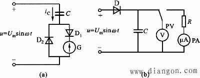 如图2(b),幅值为Um的被测交流电压经整流器D使电容C充电到某一电压Ud,它可以用静电电压表PV或用电阻(R)串联微安表PA测得。如用后一种测量方法,则被测电压的峰值