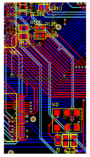 图中:U2为差分晶振,晶振背面的C101和C102为交流耦合电容。PCB的走线为:线宽8mil,线间距16mil,差分等长控制在5mil,总线长1550mil(小于器件资料的2000mil)。