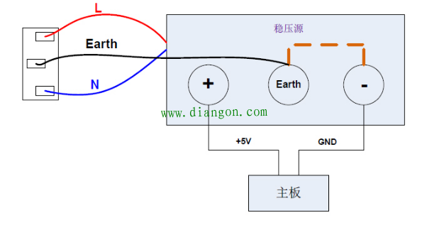 针对方案二,模拟探头标明的电阻,电容分布参数,又进行了一些试验:例如负端飞线,通过串联电阻,电容等方式接地,均无法匹配探头底线接触的现象。后来仔细分析发现,笔者的单板供电直流稳压电源的输出电压的地线与市电电力线未共地(图4),即图中虚线未连接。此时,用万用表测试示波器探头的地线与直流源(-端)输出的GND 之间,发现有个很小的电压压差。