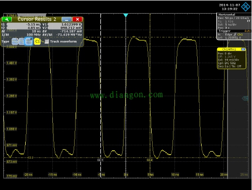 将晶振直接飞线供上3.3V的电,断开现有负载,在差分PN信号间跨接100欧电阻,再进行信号测量,发现晶振输出确实有问题,其差分信号和单端信号输出摆幅小,信号畸变严重(与图1和图2类似)。由此,基本可以得出结论:那就是晶振通过非正规途径购买的,其质量之差,唉,无语啊! 根据上述测试情况,这里总结了有两个问题,分别制定验证解决方案: