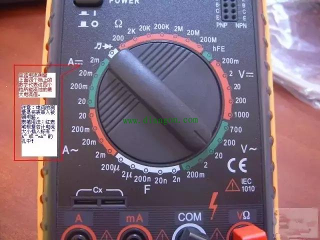 2.黑表笔插入com端口,红表笔插入mA或者20A端口;