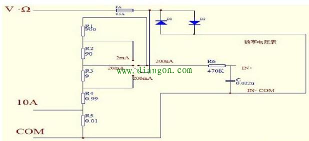 以上只是基本原理,具体实现,还有考虑待测电流的大小,把它分成不同的档位,同时考及过流保护,具体实用电路如下: