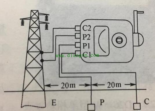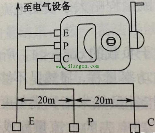 2.接地摇表的接线:首先在距离被测接地极E40米处将电流探针C插入土壤深度约40cm,再将电位探针P插在被测接地极E和电流探针C中间,三者成一直线且彼此相距20米。最后用导线将E与仪表E端钮相接,电位探针P与仪表的P端相接,电流探针C与仪表C端相连接。如下图: