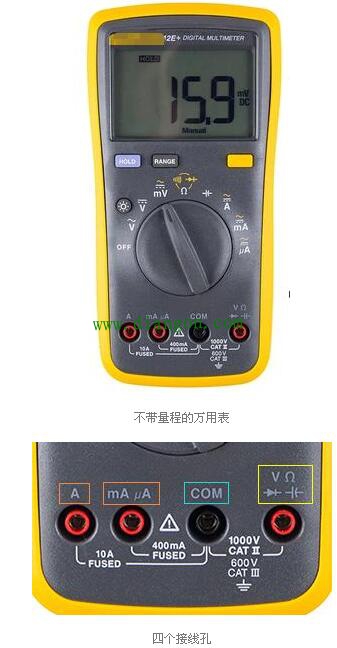 万用表一般使用一黑一红两根表笔进行测量,表身上一般有4个接线孔。一般习惯把黑色表笔接在参考地线上,也就是标有“COM”的接线孔。