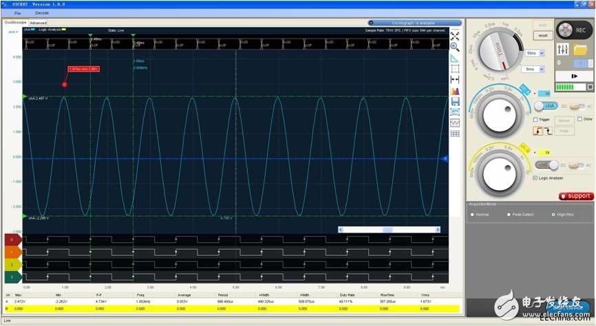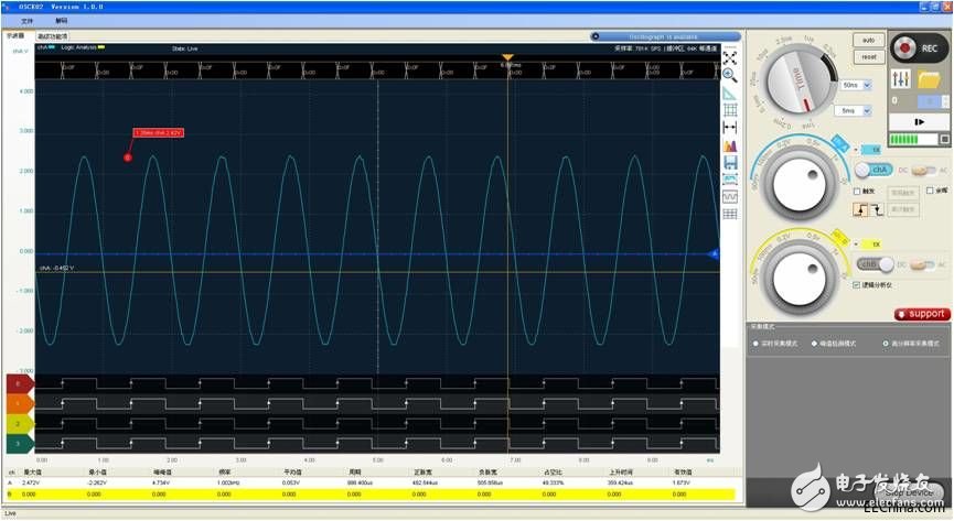 在数字电路中,分析或测试数字信号时。使用示波器就会显得有些力不足。在此影响下,我们决定开发一款带有4路逻辑分析的示波器。可同时测量1路模拟信号和4路数字信号。软件效果如图所示。