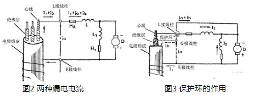 兆欧表的“L”和“E”两接线柱之间由于距离近,在几百伏直流电压作用下,直接从“E”漏电到“L”的电流a很大,参阅图2。如果让它和流经绝缘电阻RX的电流I1一同流入电流线圈La,那么La就要受到一个和漏电电流相当的附加转动力矩。这个力矩就会使指针所指的读数和实际的RX值不符。除此以外,在测量电阻大的绝缘物时,从绝缘物表面漏过去的电流b也会经L接线柱流入电流线圈La里,产生一定的误差。有了保护环G以后,由于它和发电机的负极相连(注意保护环与L接线柱之间彼此是绝缘的),如图3所示,两处的漏电电流a和b都会由保护环直接流回发电机负极而不再经过电流线圈La。因此,a和b不会影响绝缘电阻RX的读数,即保护环起到了保护作用。