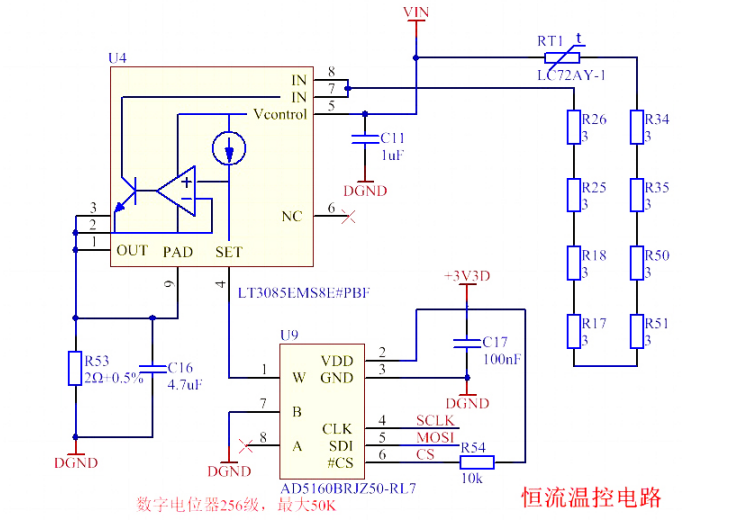 配上数字电位器,MCU可以实时调节电流变化,以控制加热器的功率输出。并且恒流方式调节频率低、过程平缓不会引起电压信号的突变。部分电路原理图如图8。