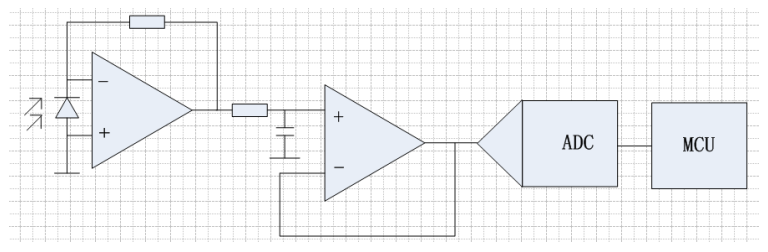 光电转换电路一般采用光电二极管(PD) + 运放 + 模数转换器(ADC)方案(如图10)。由PD采集反射光,由运放流压转换并放大信号,然后ADC转换为数字信号给MCU。由于PD工作于光伏模式,因此负责流压转换的运放需要超低偏置电流;为了提高分辨率,ADC需要尽量高的处理位数。