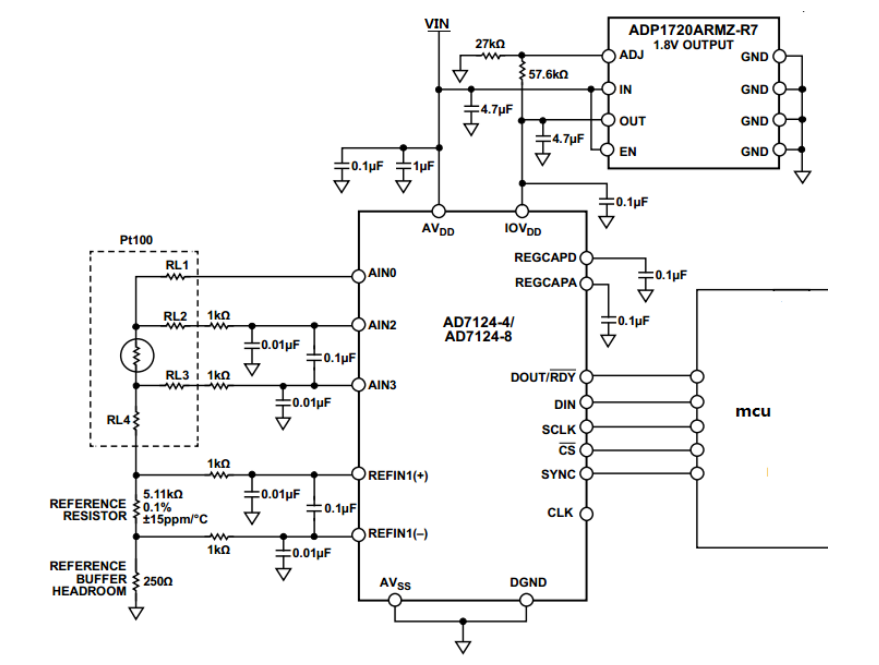 PT100采用4线制,两线用于信号采集,两线用于激励源通电流,这样无论信号线多长,都可以消除线电阻对信号检测的影响。流经RTD的电流也会流过精密基准电阻,产生基准电压。此精密基准电阻上产生的电压与RTD 上的电压成比例,因此,激励电流的波动会被消除。