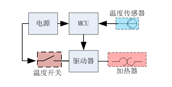 恒温控制电路由加热器 + 温度传感器 + 温度保护器 + 控制器构成,如图6。温度开关用于加热失控时的过温保护,MCU接受来自温度传感器的反馈,利用PID算法去控制驱动器调节加热器的功率输出,达到恒温控制的目的。
