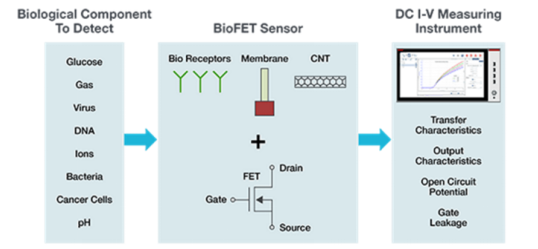 业界在基于半导体的生物传感器中的研发投入一直很多,因为其成本低,反应快,检测准确。特别是基于场效晶体管的生物传感器或者bioFETs,被广泛用于各种应用,比如生物研究、即时现场护理诊断、环境应用,甚至食品安全。