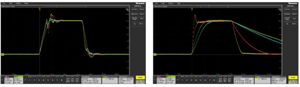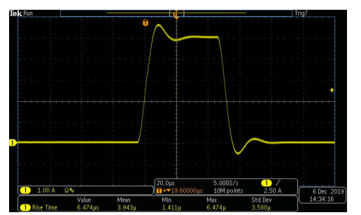 这种新型仪器最具创新性的功能是不要求手动调谐,不管电流幅度是多少,也不管电感负载高达3 μH。在输出电流脉冲时,线缆和电感可能会成为难题。电感可能会有限制效应,甚至会带来损坏。电感在不同器件之间通常是不同的,即使是在测试晶圆上的激光二极管时。电感对电流源的影响在于,电感会阻止电流变化。这会导致电流源提高输出电压,在脉冲稳定时导致过冲和振铃,而这在测试中是不可接受的。