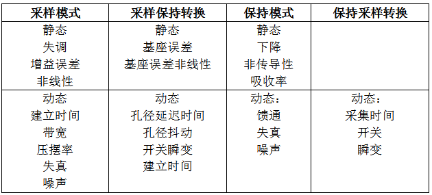 描述SHA基本操作的规格有四组:跟踪模式、跟踪转保持、保持模式、保持转跟踪。图2总结了这些规格,图3以图解方式显示了SHA的一些误差源。由于每种模式同时涉及到直流和交流性能,因此要正确指定SHA并了解其在系统中的操作是一件很复杂的事情。
