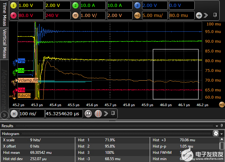 我们使用商用 650 V 额定电压 GaN E-HEMT(增强模式高电子迁移率晶体管)评估了我们定制的 GaN 测试板的性能。图 3 显示了在 VDS(OFF) = 400 V、IDS(ON) = 30 A 时 GaN E-HEMT 开关的开启波形。黄色波形显示了钳位漏极电压 (VCLAMP),棕色线显示了 RDS(ON) ) 由 VCLAMP/IDS 计算,使用示波器上的 20 MHz 低通滤波器设置。黄色波形显示测得的 VDS 被钳位在 4.5 V 左右,并且清楚地测量了 2 V 左右的 VDS(ON)。RDS(ON) 波形的峰峰值噪声约为 1 mW(就 VDS(ON) 而言为 30 mV),这比我们上面讨论的原始 VDS 分辨率 0.78 V 精确得多,足以评估动态 RDS (ON) 对于大多数 GaN 功率晶体管。