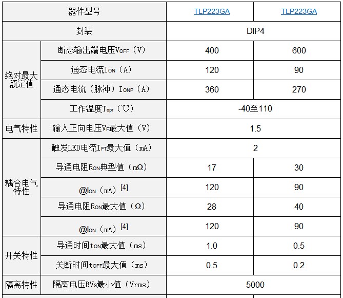 新产品配有东芝开发的高发光效率LED,最大触发LED电流为2mA。这比当前产品[1]低33%左右,因而支持较低的输入功率。缩短开关时间的特性(导通时间、关断时间)可确保更快的运行:TLP223GA为50%[2],TLP223J为75%[2]。