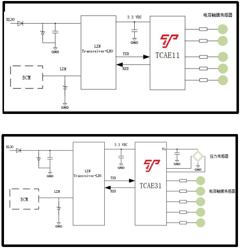 TCAE31-QDA2包含TACE11-QDA2的所有电容触控功能,另外还集成了惠斯通电桥模拟前端电路,包括低噪声电压源,2级最高1024倍增益放大PGA, 高精度ADC,失调电压动态补偿等电路单元,可实现22 bits宽动态和最小3.6uV信号测量,适合于外接多种形式的电桥类传感器用于压力检测和测量功能,适用于MEMS压感,应变片压感,及电阻压感等多种压力传感器的信号调理和采集及算法处理。是全球首款同时集成电容触控和压力触控的车规级SoC芯片。TCAE31-QDA2充分考虑了实际应用中可能面临的复杂变化要素,如由于装配,温度,湿度,老化,干扰等引起的参数变化,通过宽范围实时动态补偿结合智能演算法实现压力检测的持续可靠性。再结合电容触摸通道,实现电容+压感复合智能按键,可真正实现汽车应用所须的高抗干扰,防误触,防水等高可靠性要求,适用于如智能表面,智能B柱,智能中控,智能Logo,智能门把手等复杂车内和车外应用环境。