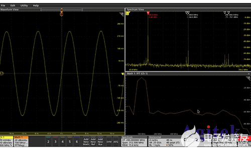 图2测试了一个100MHz的CW信号,捕获了4个周期的时域波形。图中分别使用Spectrum View和传统的FFT(Math功能)测试该信号的频谱,通过对比可以看出,由于时域捕获时间较短,导致传统FFT频谱的分辨率非常低。相反,Spectrum View的频谱测试结果非常好,不仅具有高分辨率,而且底噪也非常低,可以清晰地观测信号本身及其谐波和杂散。与此同时,由于水平时基设置得较小,还可以观测到时域波形的细节信息。